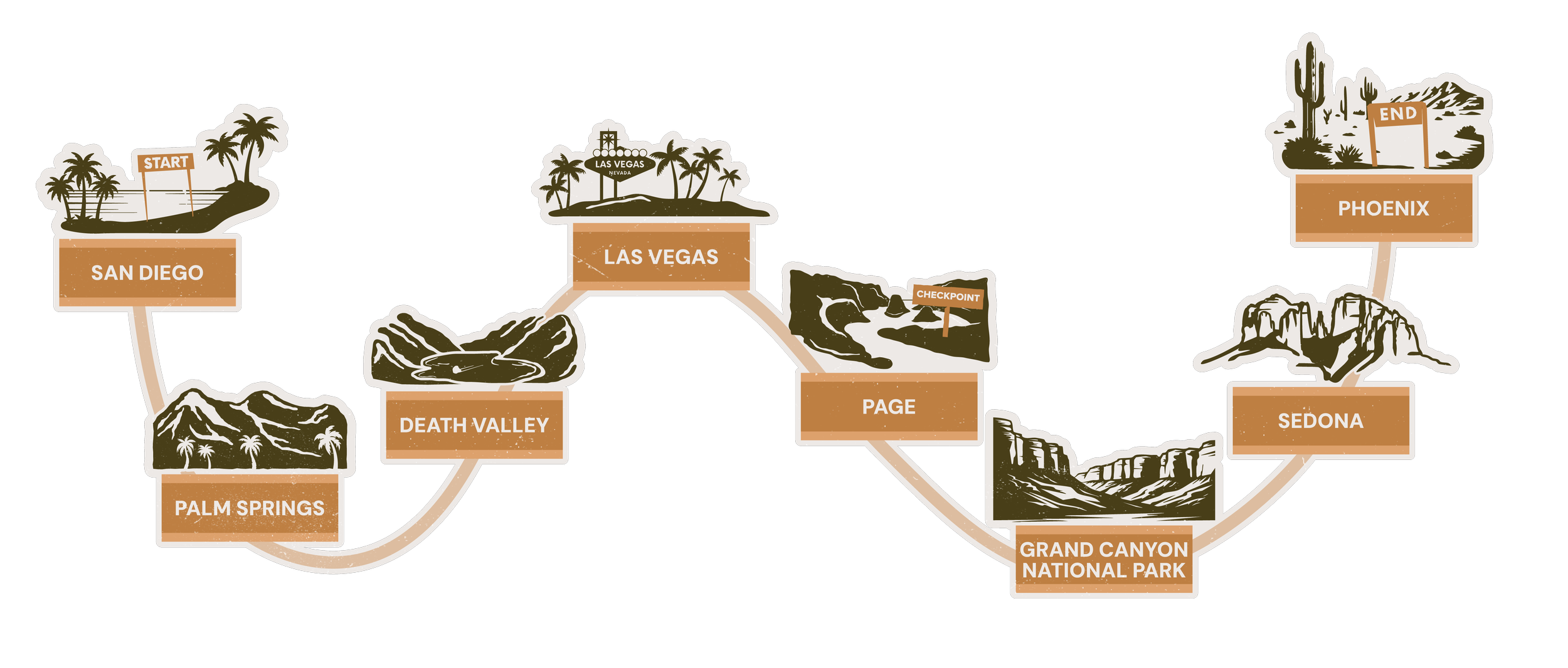 So, you can hit all the places that we suggest, OR you may want to check out other places along the way and go on a different route while still ending up at the same finish line destination.